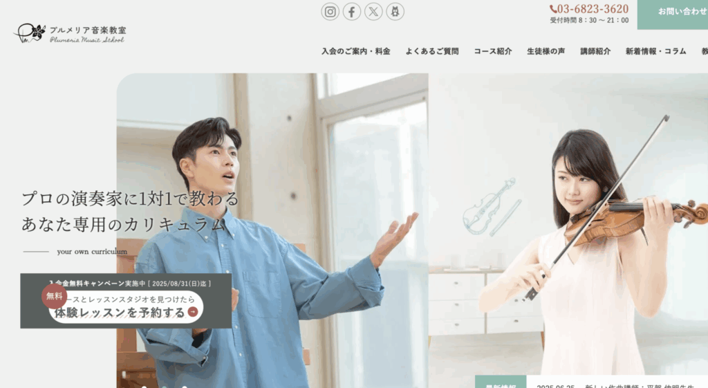 プルメリア音楽教室は、東京・神奈川・埼玉を中心に130か所以上のスタジオでレッスンを提供する音楽教室です。ピアノやバイオリン、ボーカル、ギター、管楽器、作曲など多彩なジャンルに対応し、指導は全て現役のプロ演奏家が担当。4歳以上から大人、音大受験を目指す方まで幅広く対応しています。