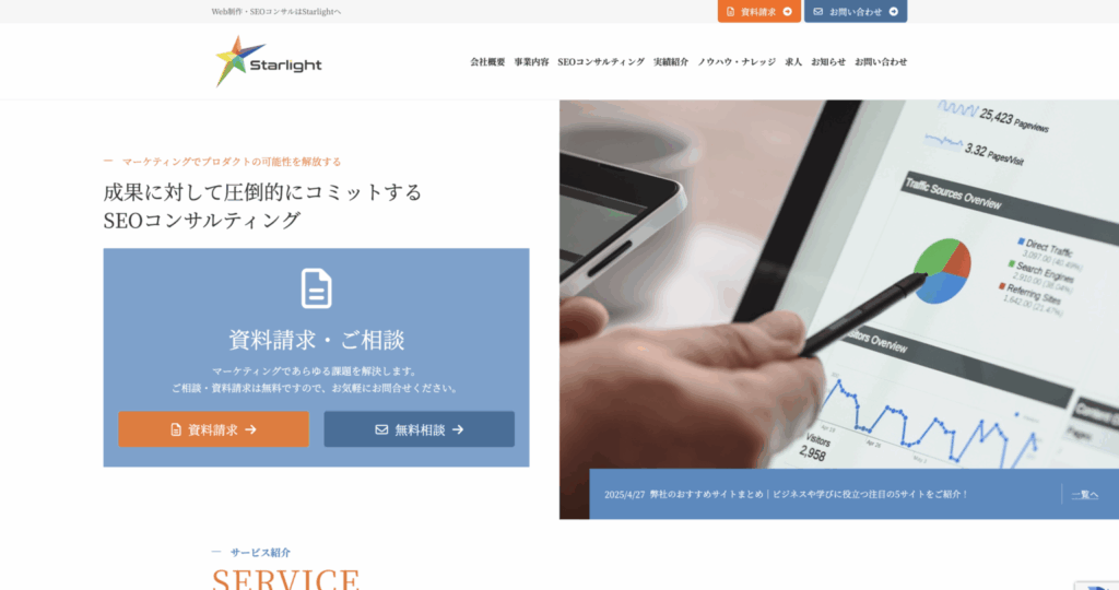 株式会社Starlightは、東京都豊島区に拠点を置き、SEOコンサルティングを中心に、Webサイト制作やオウンドメディア運用、SNS・広告運用代行など、幅広いWebマーケティング支援を手がけています。専門的な知識と柔軟な提案力で、企業の課題解決と成果向上をサポートしているのが特長です。